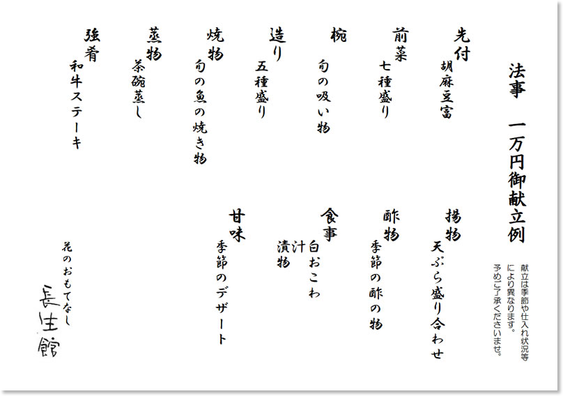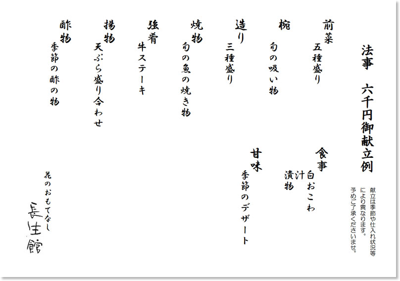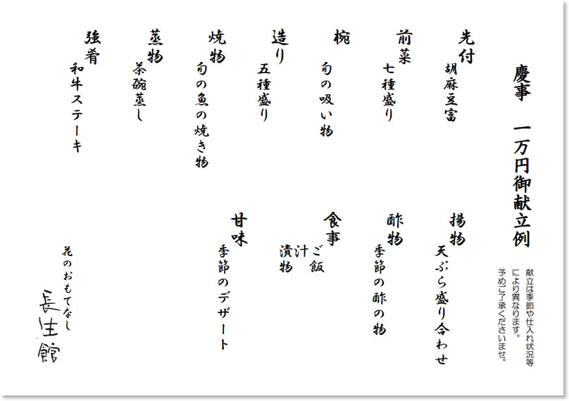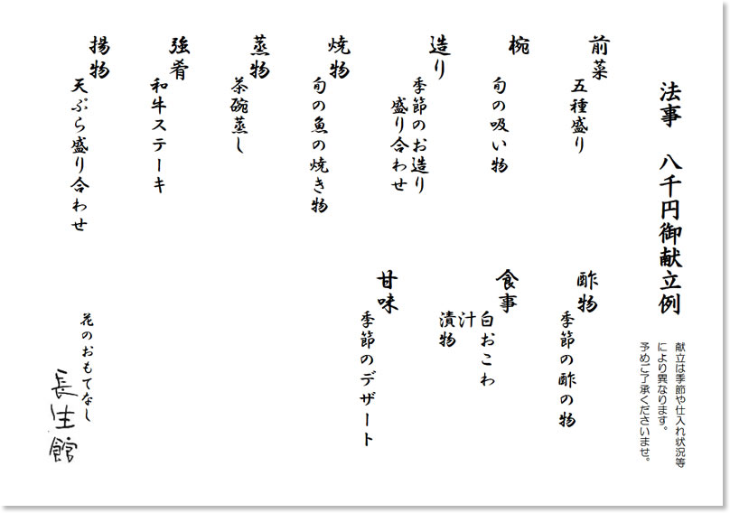 慶事や法事等、様々なお食事席を長生館でどうぞ。ご予算に応じて承ります。