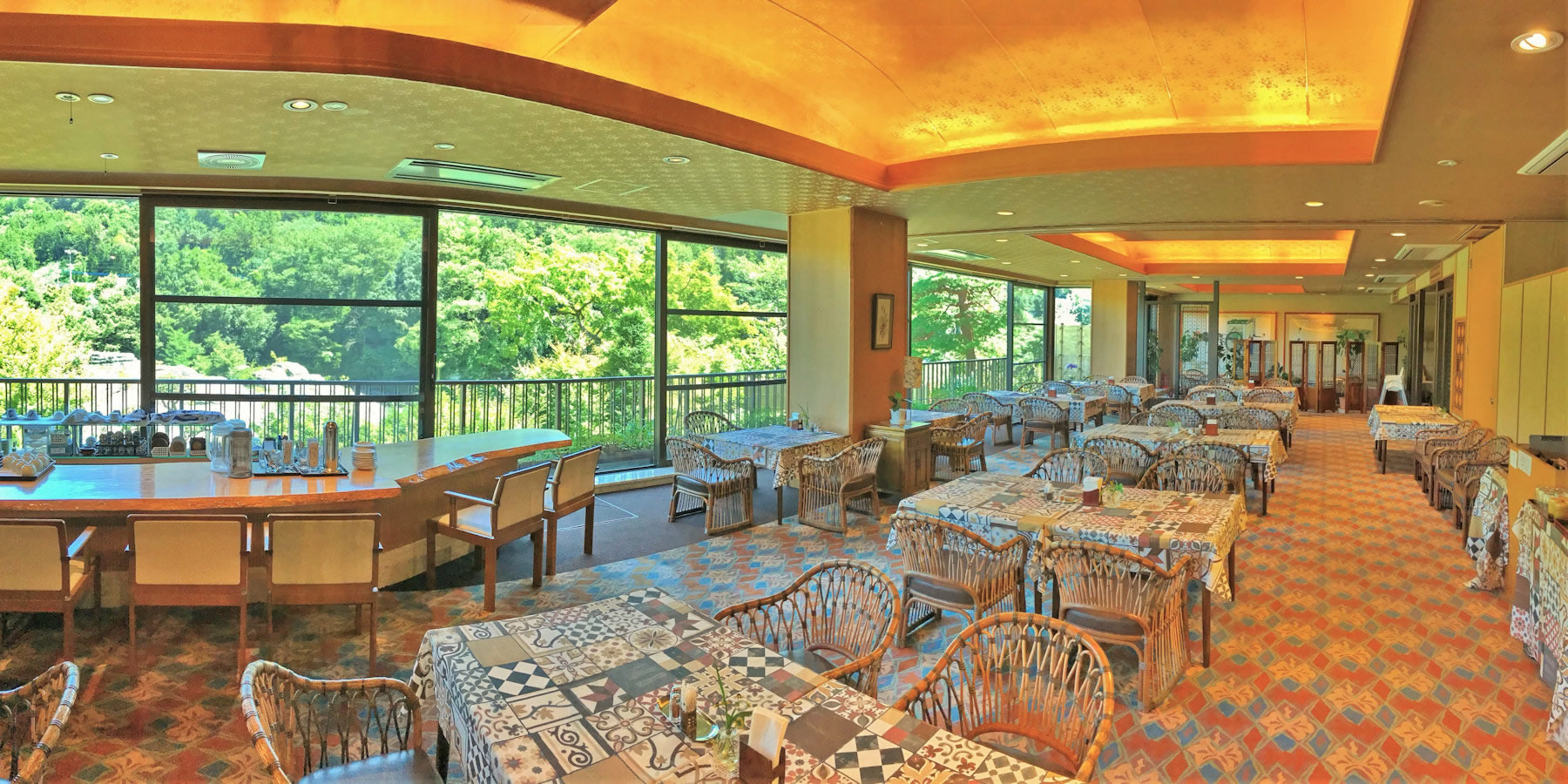 レストラン 岩ざくらは、当館の本館にある、長瀞渓谷を一望できる開放感のあるオープンな雰囲気が人気の和食レストランです。一般的なレストランにもあるような仕切りのない椅子・テーブル席です。お飲み物のみのご利用も承ります。