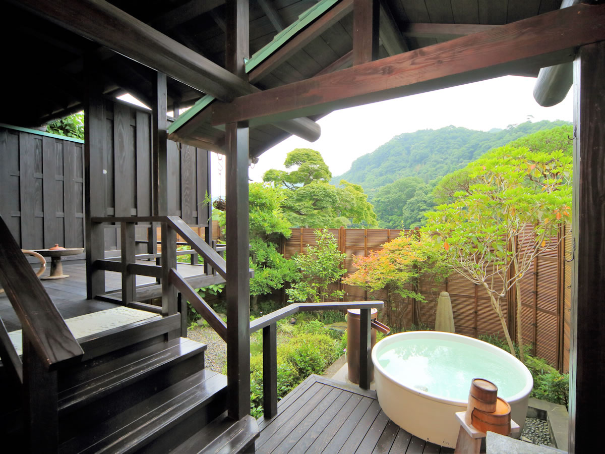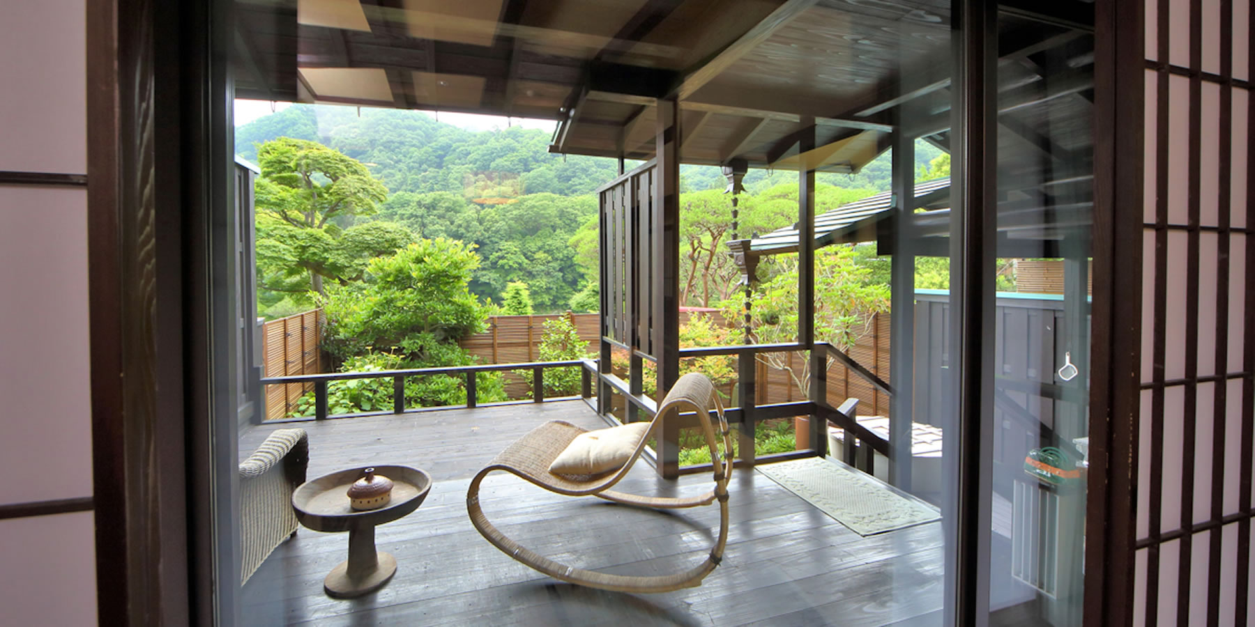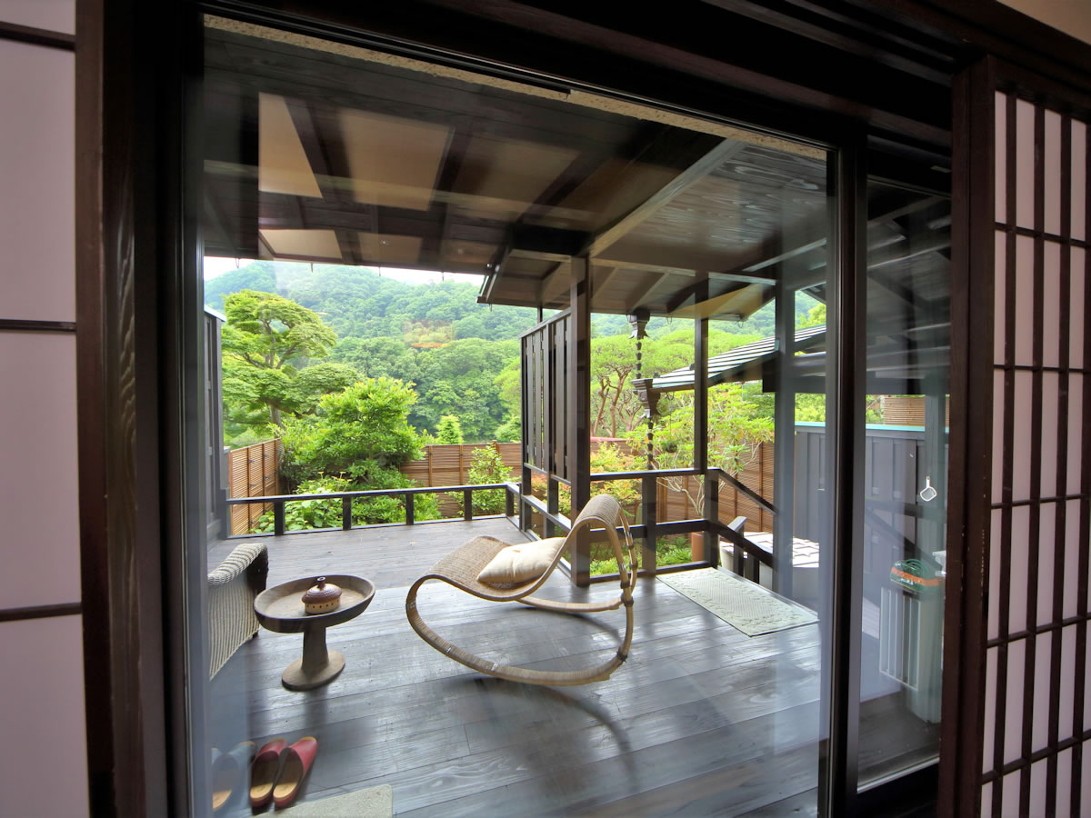 ご夫婦やカップルにちょうど良い広さの14畳和室。ベランダへ出ると、広めのお月見台テラス、真っ白な陶器の露天風呂がございます。