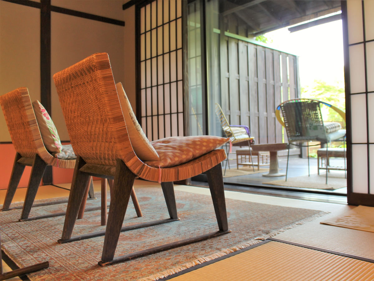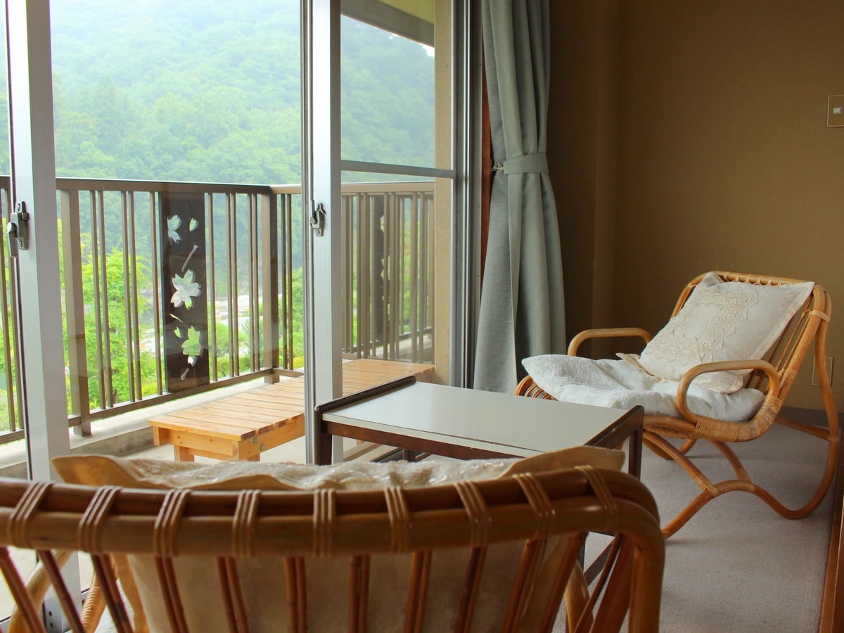2階和室は広縁があり、小テーブルと椅子2脚がございます。荒川、岩畳など四季折々の風景をお楽しみください。