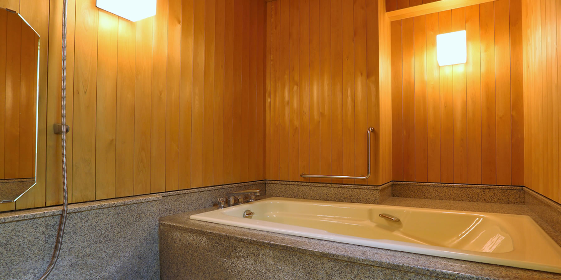 内風呂は檜張りの壁で洗い場も湯船も広め、家族風呂としても十分な広さです。トイレも2つ、洗面所も2か所ある広めの造りで、全体的に窮屈感のないゆったりとした客室です。