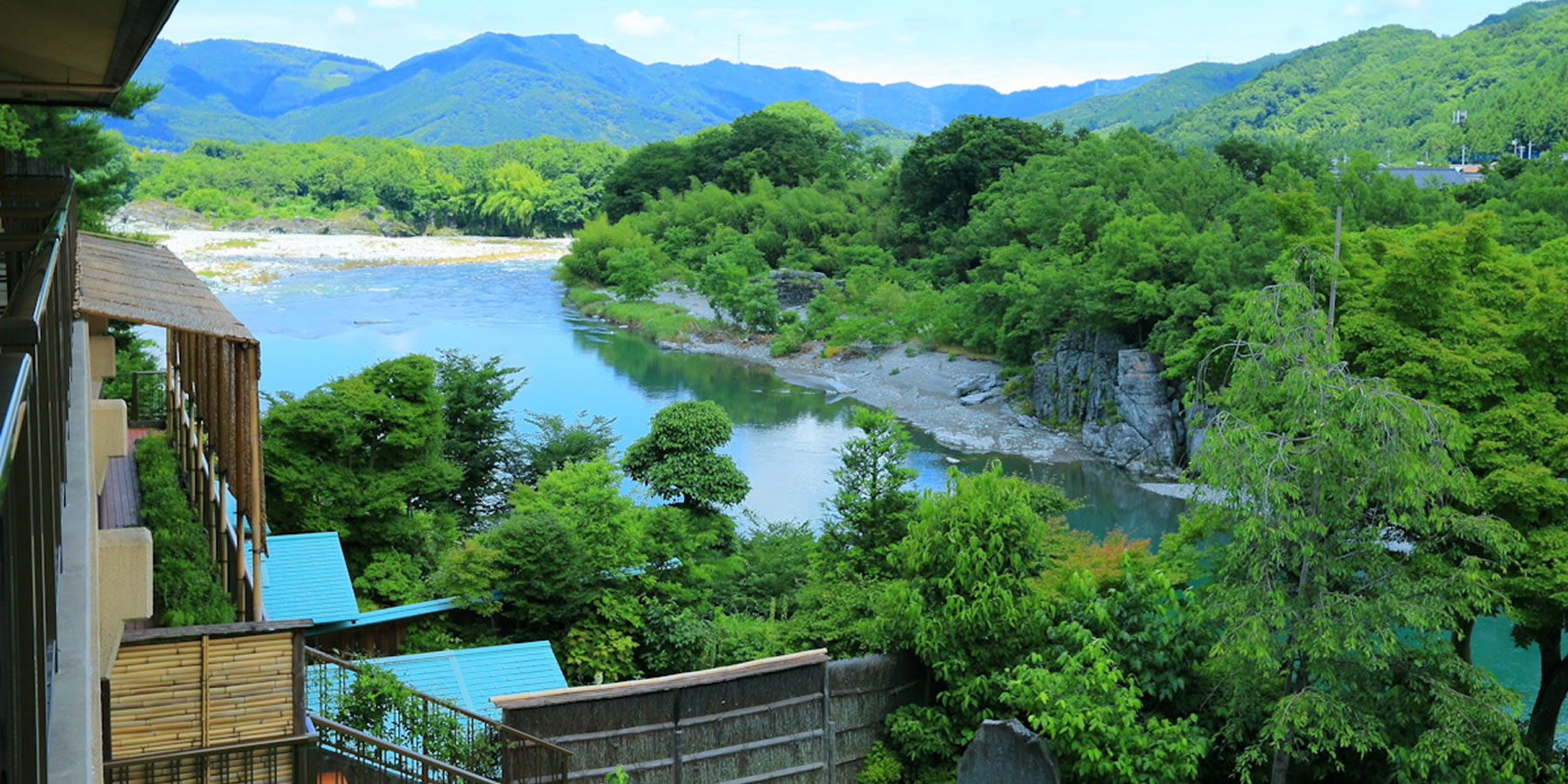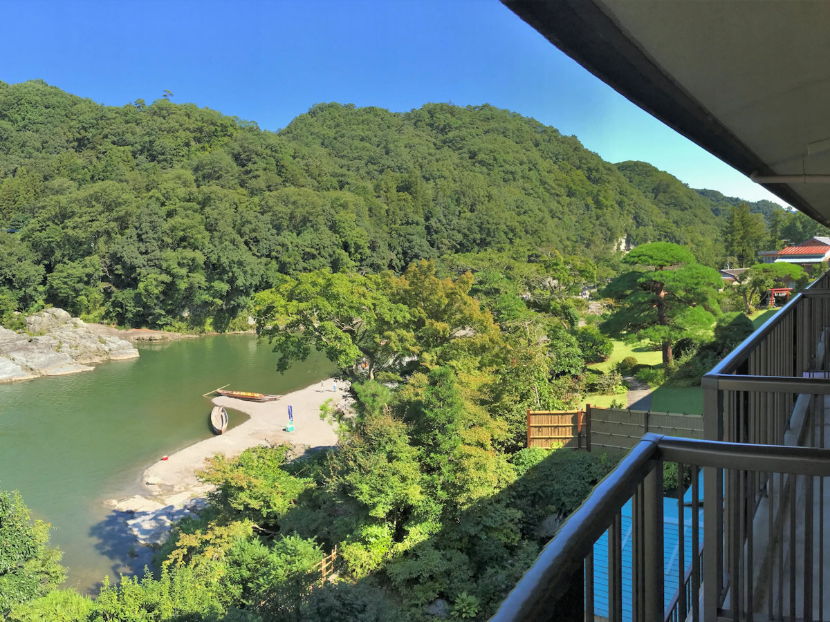 すべての客室から望める長瀞渓谷の風景は、対岸の山に西陽があたるチェックイン帯がちょうど最もオススメの時間帯です。