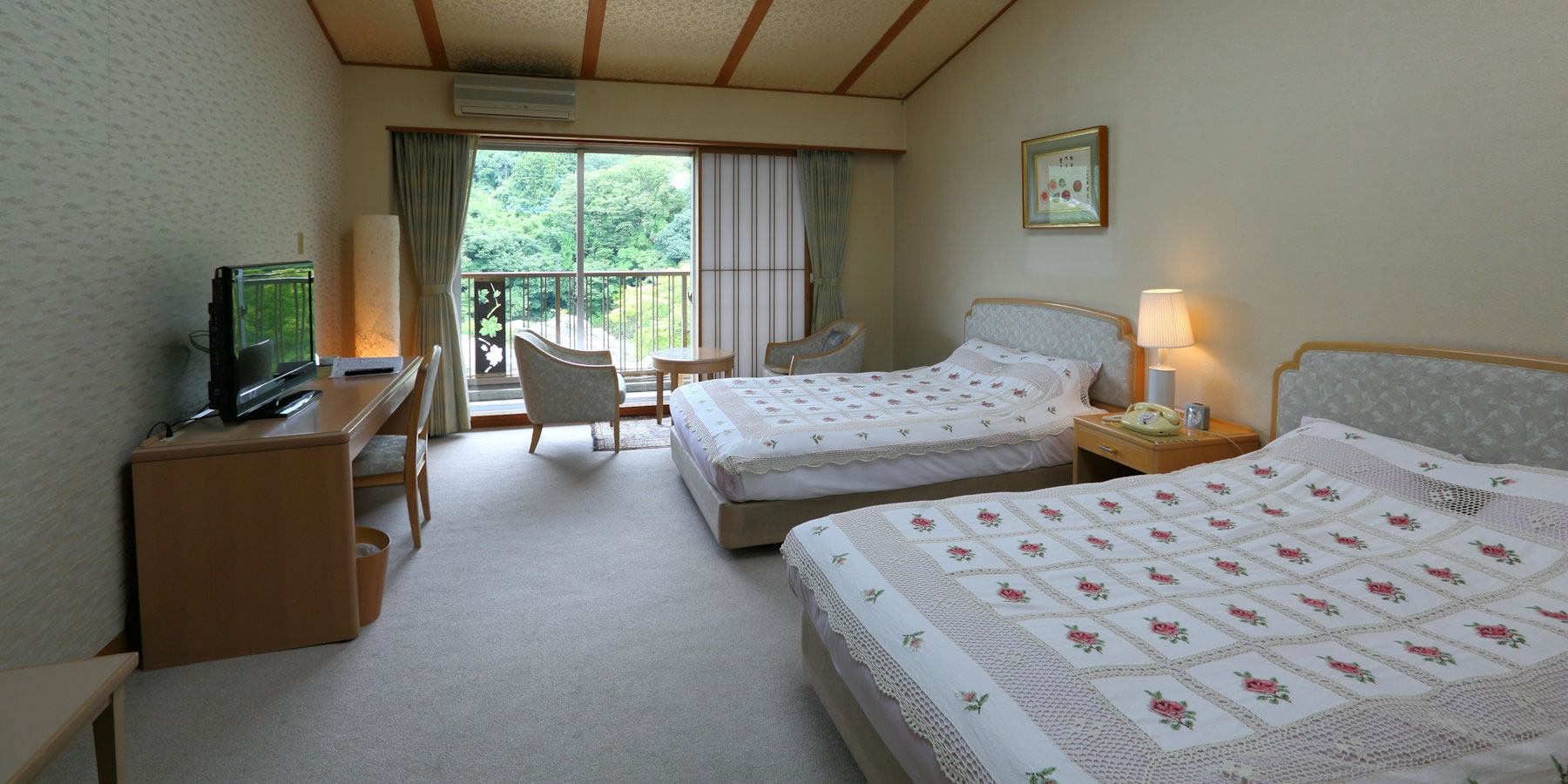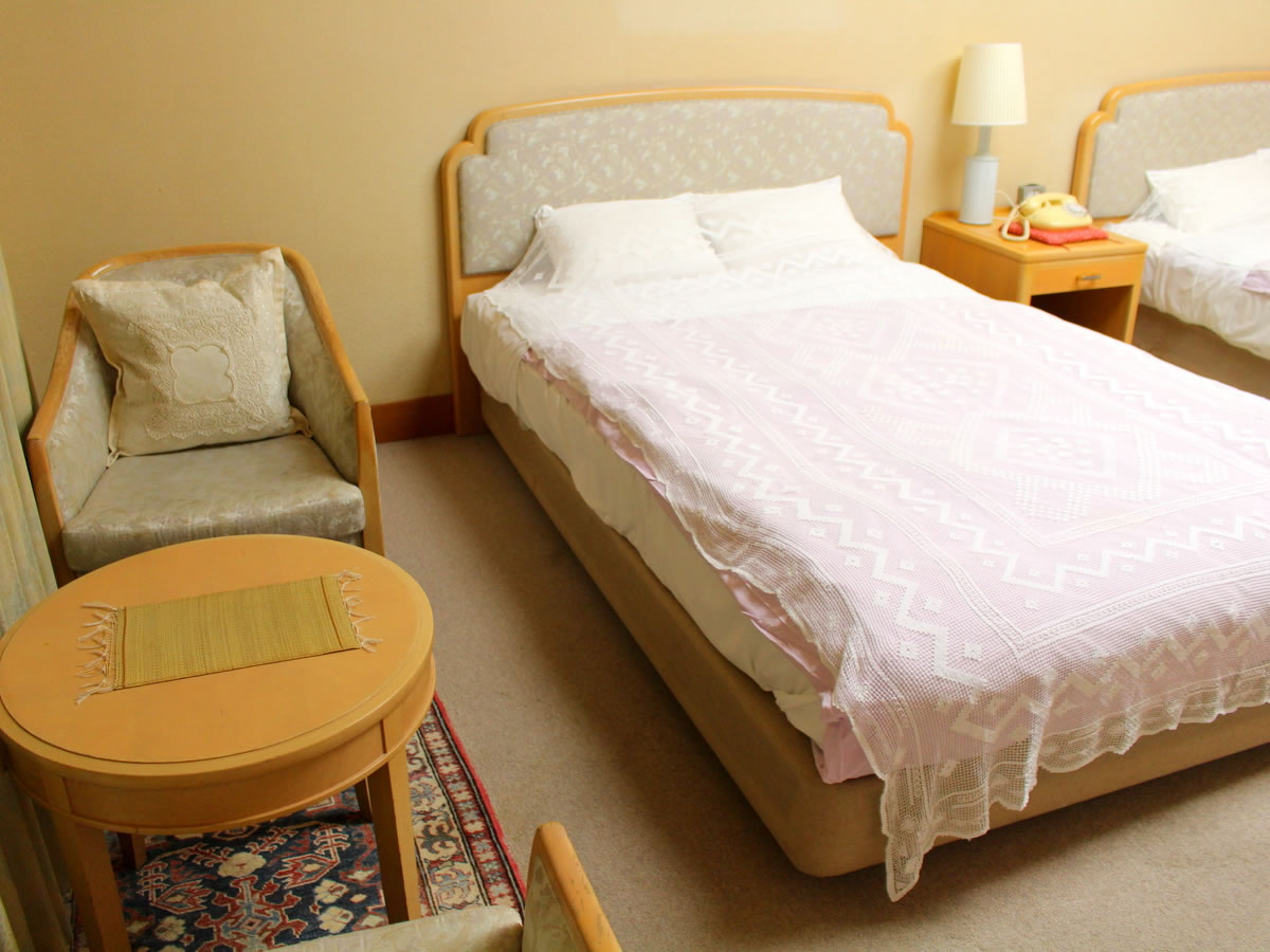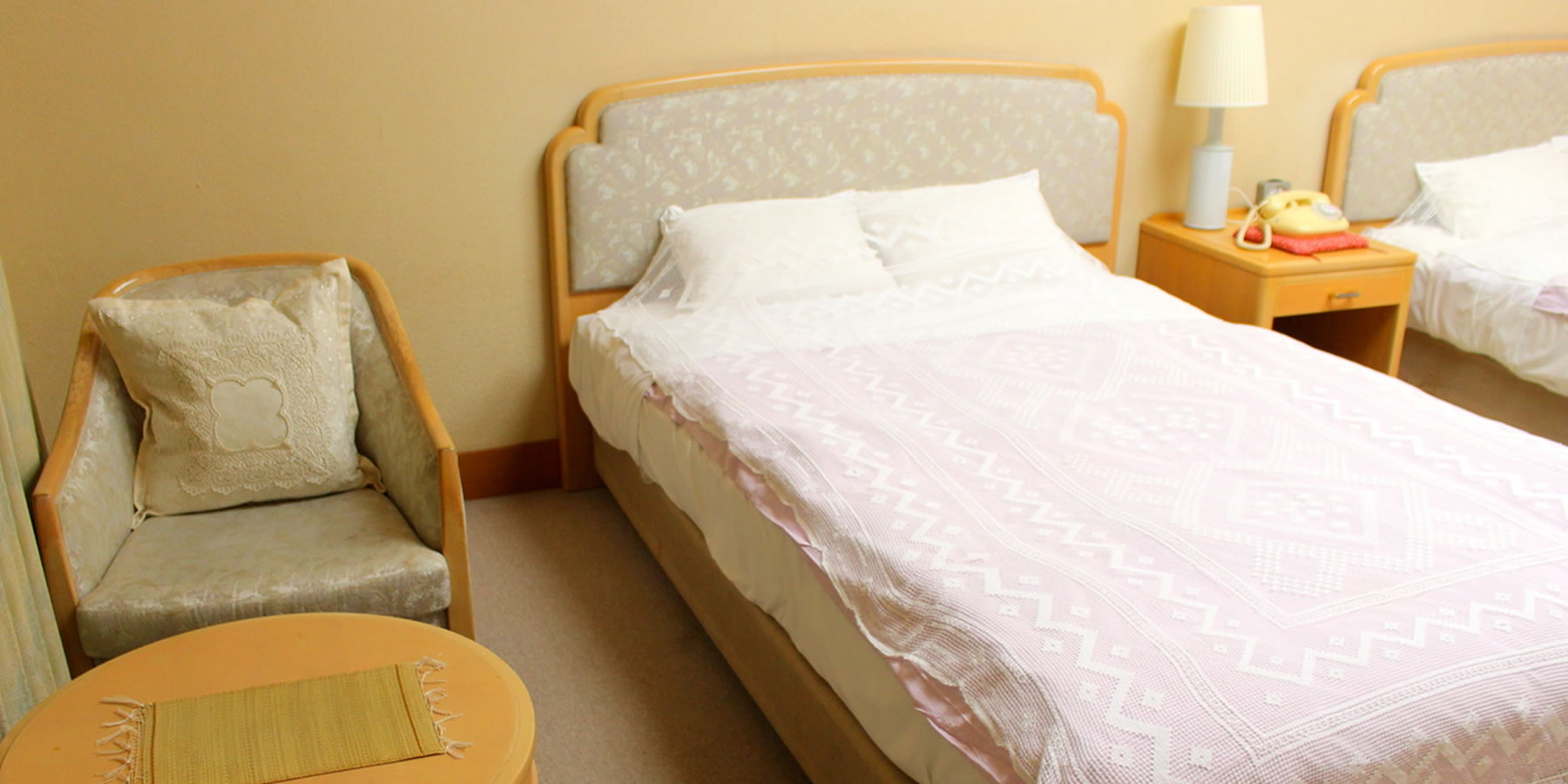 白を基調にした清潔感のある当館唯一の洋室(バス・トイレ付)です。セミダブルのベッドが2つあり、快適にお寛ぎいただけます。定員は2名様です。